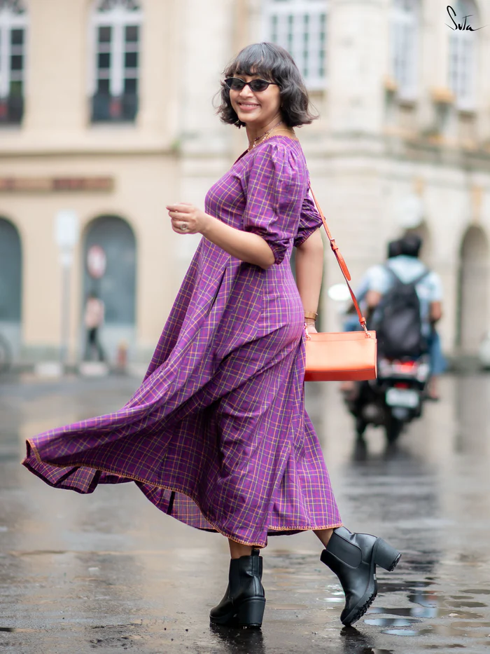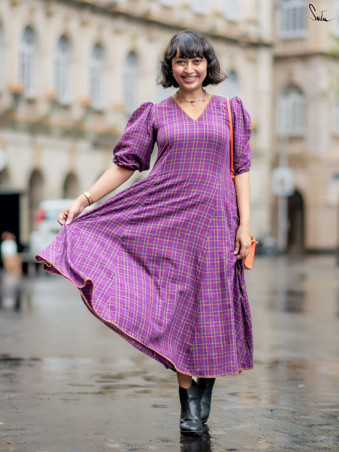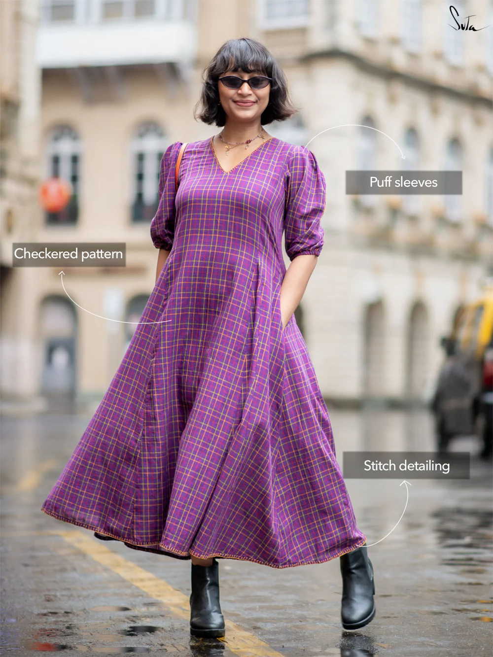Checks with a twist! This purple cotton midi dress redefines a classic in V-neckline with contrasting mustard blanket stitches, a design detail that subtly draws attention. The breathable cotton keeps it summer-ready, while the puff sleeves and easy flare make it an all-day comfort pick. Itās your go-to for market strolls, casual catch ups, or just feeling cute on a weekday.
