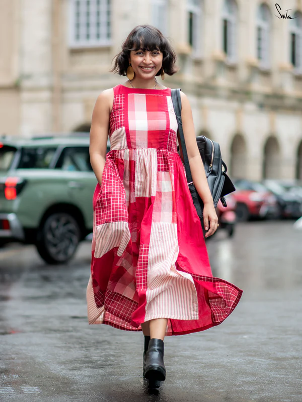This maroon and white patchwork cotton midi features a cleanboat neckline, abuttoned slit at the hemfor adjustable movement, and a carefully embroidered heart at the back yoke, a hidden detail that feels like a secret between you and your dress. The geometric blocks of maroon and ivory are pieced together in harmonious rhythm, creating a look thatās both contemporary and nostalgic.