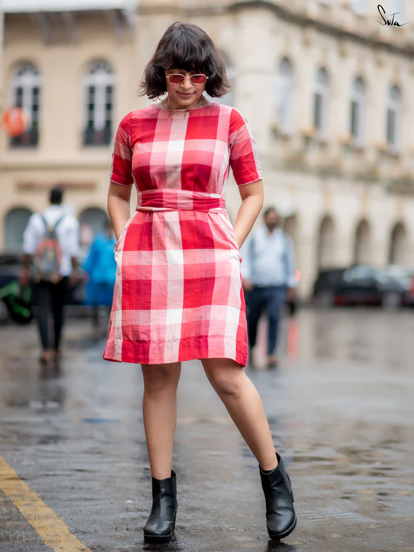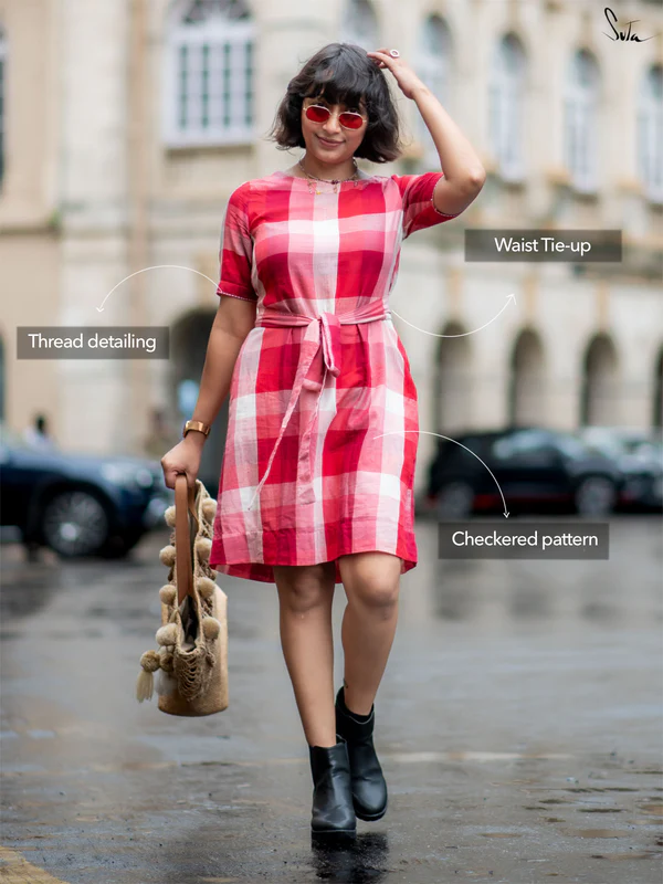 Red And White Checkered Cotton Dress With U-Neckline Adjustable Waist Tie-Up And Cute Short Sleeve