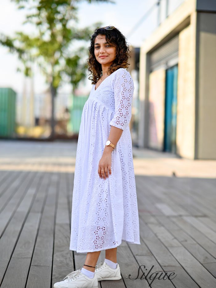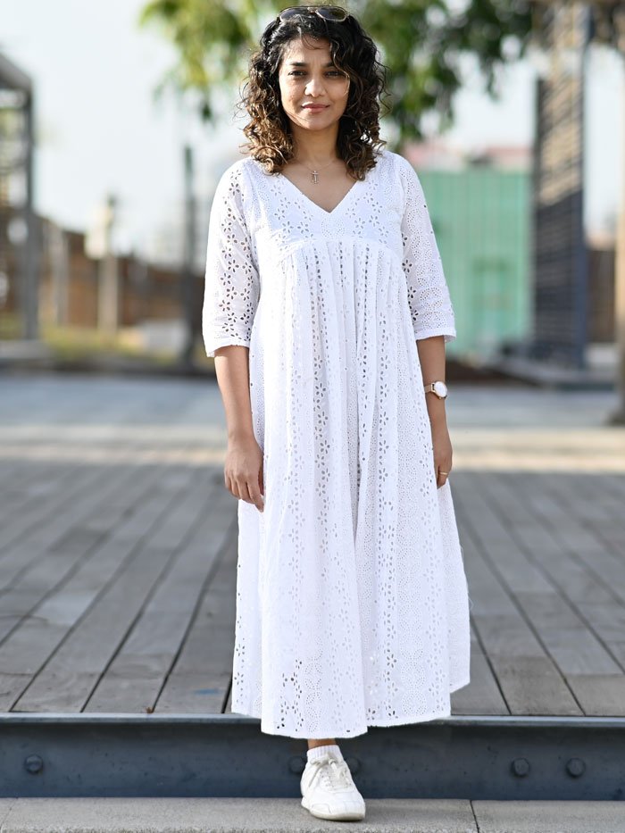 White Hakoba Cotton A-Line Dress with Aliya Cut